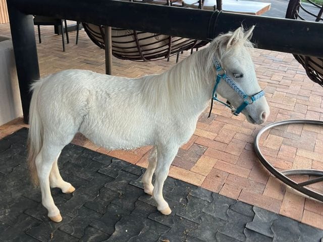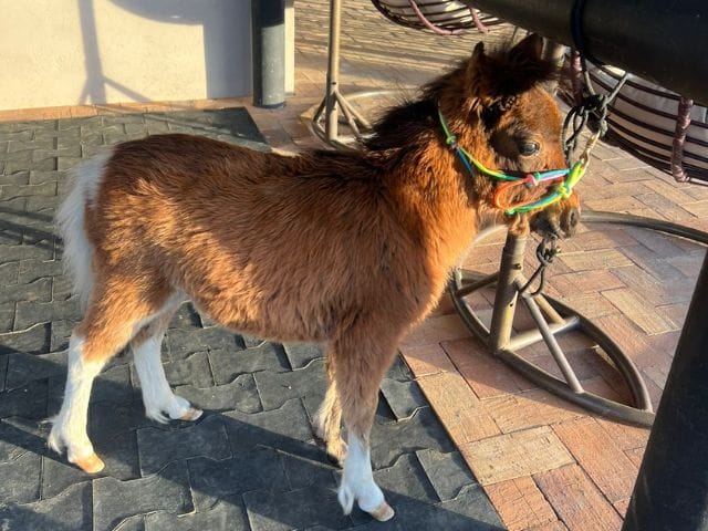Hembra Mini Horse, nacida en febrero de 2025, con una alzada aproximada de 70 cm a diciembre de 2025. Destaca por su buen desarrollo y tamaño ideal para compañía o proyección futura..